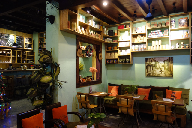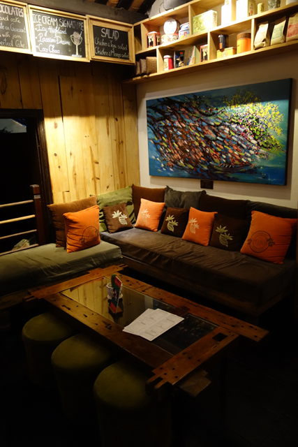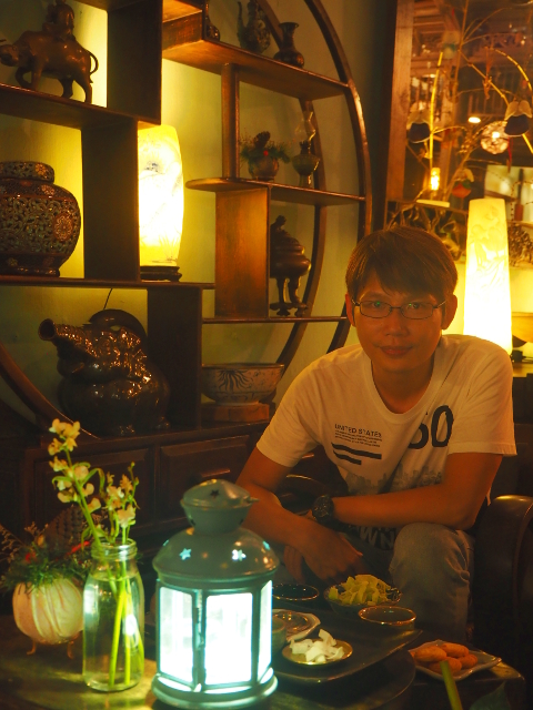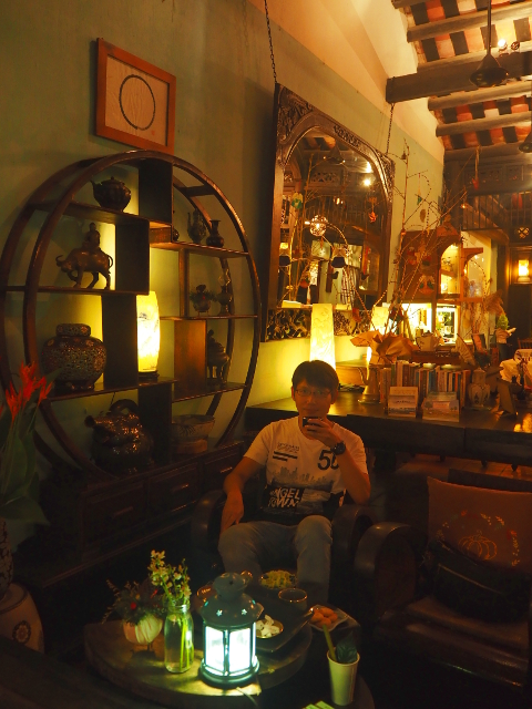 飲盡了蓮花茶,剛好也走到想久坐的「Reaching Out Teahouse」,昏暗廳間裡,能見不少茶具、工藝品的展示,座席方面相當混搭,最裡的小庭院擺了洋式勾捲鍛鐵椅,大廳有花藝配襯的中式桌凳,邊角藏著日式跪坐木板區,猶豫幾許後,我選了靠門的小沙發,把自己變成懶骨頭。這兒較特別的是店員皆為聾啞人士,若有需求都得以事先做好的字牌或用紙筆表示,也導致進來歇坐的客人都相對安靜。這很切合我的心性,畢竟越老越怕吵,最討厭那些把店當自己家一樣,嘰嘰喳喳大聲談笑的客人了,完全破壞店家設定的調性,也干擾旁人的閱讀寫作。