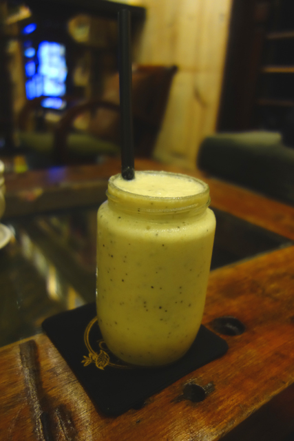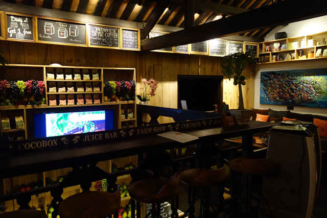 喝過了茶,便對同樣列於計畫中的飲料店「COCOBOX」感到猶豫,偏偏它的二號分店就在附近,望著裡頭以水果格架支起的挑高空間,因無顧客而顯得靜謐的氛圍,就進去找位置坐下了。店裡賣的品項相當多樣,除了主打的果汁,也有咖啡、茶,以及取名奇幻的冰淇淋,儘管後兩者挺具惑力,在不想咖啡因過量的前題下,最後選擇了奇異果奶昔。座位方面,其實整個二樓都算被我們包下,大可偶爾到陽台看街間燈點如螢,不過室內沙發靠著很舒服,就懶得動了。一邊啜飲,一邊望著櫃架縱橫如枝,紙袋、瓶罐,降低彩度的標籤們成了綴生的繁花,而架下的抽象畫作,應是仿擬長川的魚群悠游吧,斑斕間爍著水面的映光。