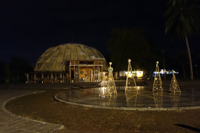 而繞來此島,當然不是為了逛夜市或討皮肉痛的,主要目標是島東的表演廳「Lune Center 」。其劇目中有很具特色的現代舞「A O Show」,雖是越南農漁生活的表達,使用的也是簡易的竹竿竹簍,藉由經過設計的舞台,意象式的舞蹈編排,再搭配拋接、翻筋斗、轉環之類的特技,顯得相當有意思。可惜檔期沒對上,便僅能過來看建築了,畢竟它用木竹搭接的外觀相當特殊,像個小小巨蛋,以枝條的菱紋編結作為自身衣妝。週邊造景亦為同樣風格,甚至還擺了一台腳踏車,上面堆滿紡錘狀的竹簍,這東西感覺應該是捕魚用,卻猜不出是怎樣的操作,況且這種運載數量真的是民家日常嗎?