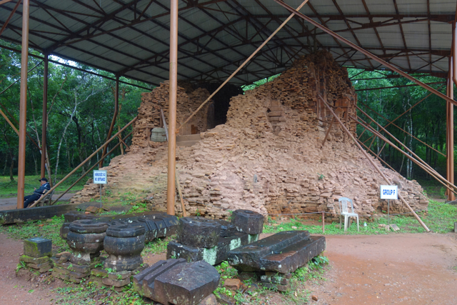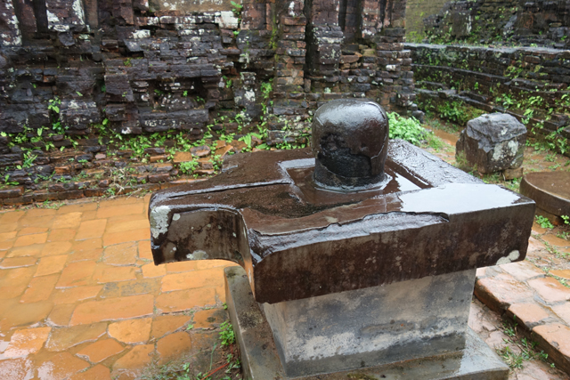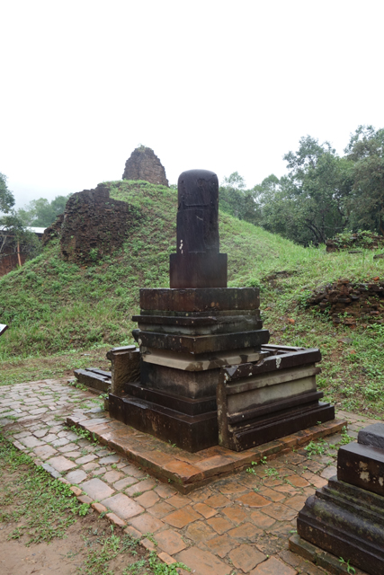 講解結束便是自由放風時間,D區之後的BC兩區照佈局圖應有牆包圍隔分,走出小展館後卻一覽無遺。與D1同處中軸的塔門B2僅剩框邊,後頭的B1更悲涼,本該以神龕主塔成為視覺中心,現在只是牆礎勉強可辨的平台,立柱傾倒散亂,代表濕婆的「林伽」就這麼暴露著接飲天雨。千年時光帶來的毀損可以理解,然據說「美山」的狀況原先異常良好,偏偏遇上越戰這場大劫,經過美軍的瘋狂轟炸,仍能頑強屹立的僅有少數。