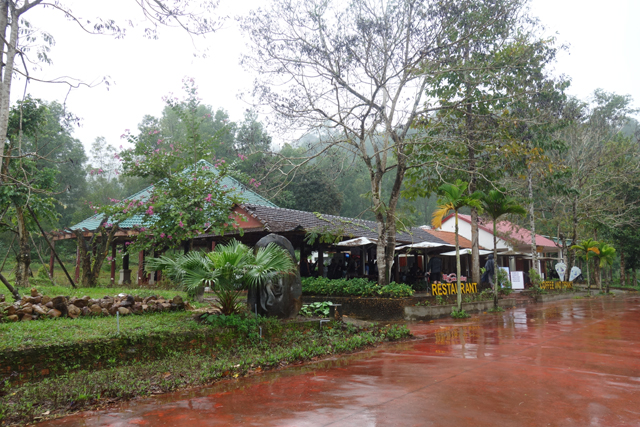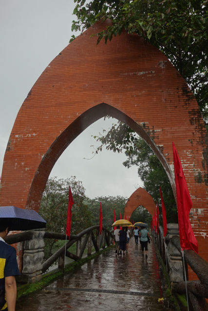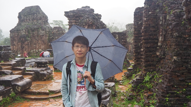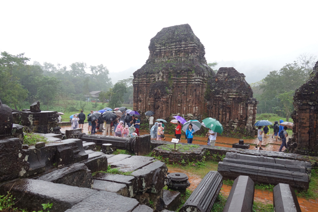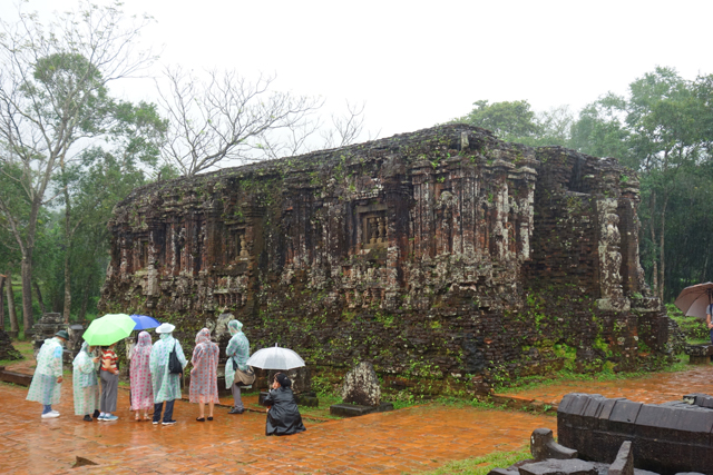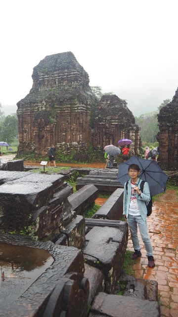 從「會安」去「美山」除了自駕,沒什麼方便的交通,一般都是報名半日遊,省時省心力。上了旅行社派來的接駁,經過約一小時的車程,我們到了景區入口,這兒有附設廁所的小咖啡廳,能感覺觀光客們外望的目光都滿無奈,有些甚至已點了餐,想等雨停再出發。我們則沒那種悠閒命,快速解放後,就被導遊招著,撐傘踏水朝遺跡前行了。