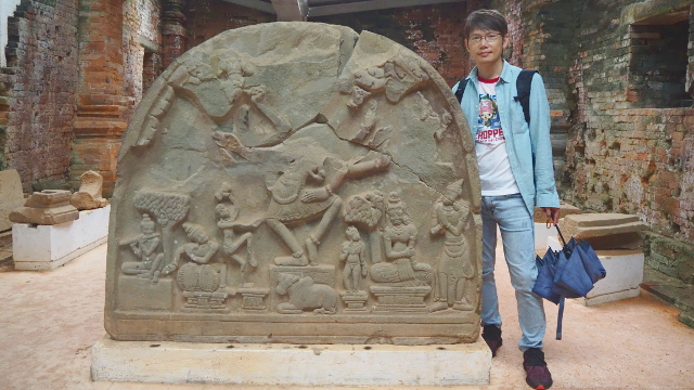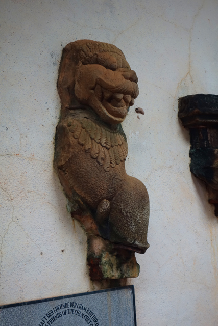宛如雙生的D2好一些,尾端還留有拱形的拉尖,或許也因其結構相對強健,被設為臨時性的展示所。進門後能看到一塊弧頂大石板,即使主角上半身已損毀,看其舞姿身段,下方跪坐的神牛坐騎「南迪」,顯然是主神「濕婆」,旁邊另有些扭舞奏樂的小人,像是記錄著一場祭典。不過後方展桌的那些石塊就很難辨出主題了,搞不好僅是考古學家嘗試拼組的工作台。能令目光再次駐留的是牆上的雕作,齜牙怒面獅、面目模糊的小人像,可惜數量寥寥,看來網路資料無錯,珍品都送去「峴港」的「占婆博物館」保存了,當初我也曾想把它排入行程,想去的景點卻太多,幾番衡量後還是忍痛刪去。
