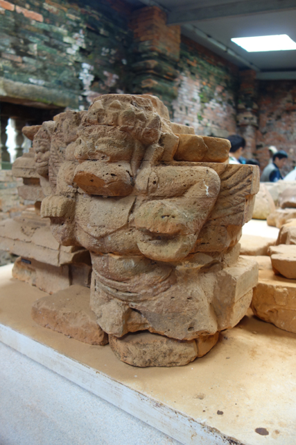 一邊聽著導遊奇怪的中文口音,我一邊瞥著說明板的佈局復原,D區感覺像這地帶的前院,以兩座長形儀式大廳各自通往其後的B區與C區。印度教早年經海播傳至以「湄公河三角洲」為中心的「扶南」,與其相鄰的「占婆」也受到強烈影響,雖然這兒建築多半相當殘頹,仍舊勾起我於印度遊逛的回憶。若是同一脈絡,儀式大廳應有著長拱狀屋頂,而眼前的D1只能見到微弧牆頂,疊磚在剝落後,被草苔抹糊了稜線。牆側那些成列如殘碑的,本來上頭也都有人像,可惜僅剩一尊無頭坐像孤獨守望了。