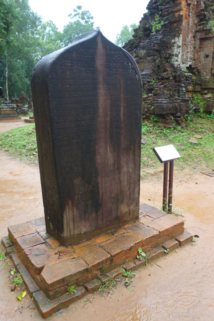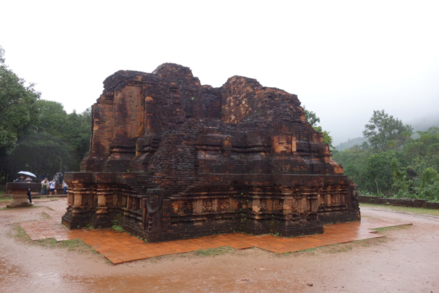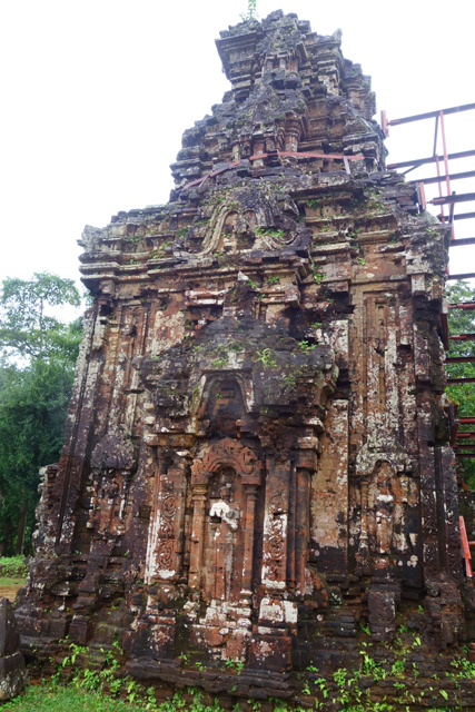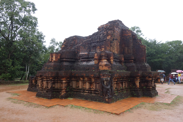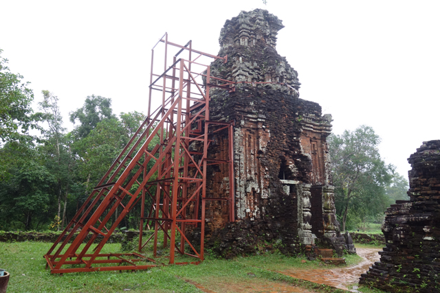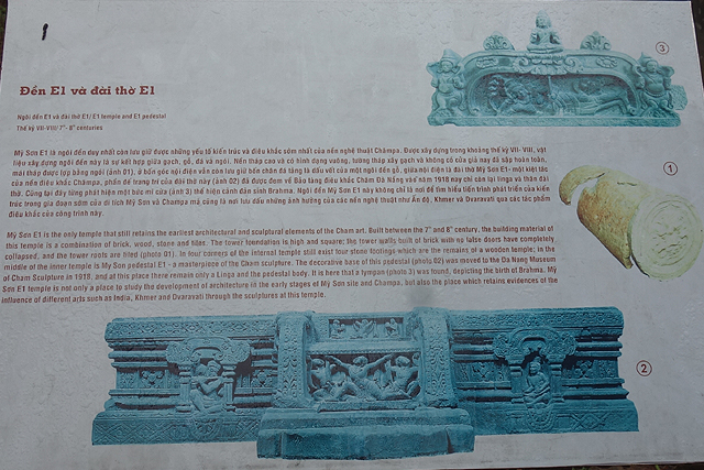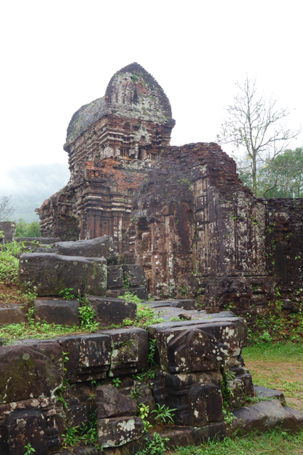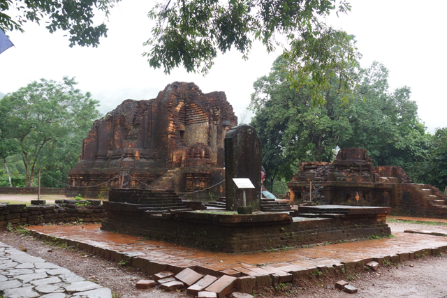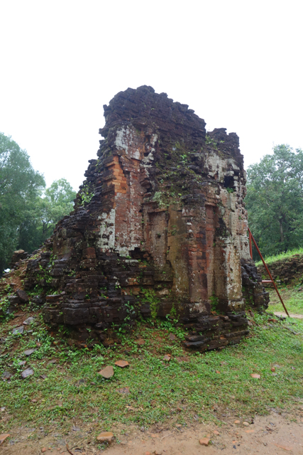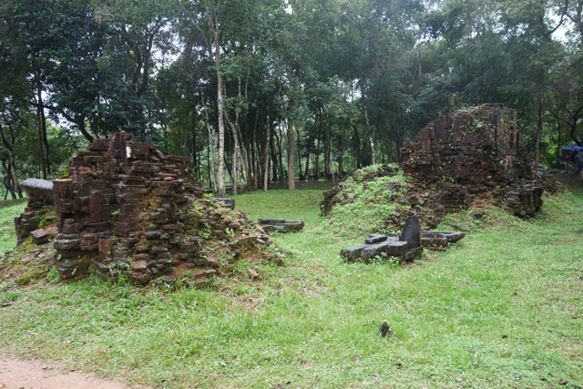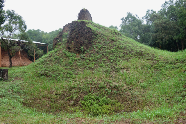 再循環道走,EF區又是另個災難場,根據殘遺的石碑,它原是「美山」最古老的建築群,可追溯至七世紀,並於十二世紀大幅增修,結果越戰砲彈襲來,如今幾乎無存。兩座主塔中的E1消失殆盡,E4的塔身頹散成土堆被野草侵染,僅餘尖頂探首。用來祭祀王室祖宗的副塔E6,是仍有牆構還堅持著,殘斷的模樣已難推想其原形。