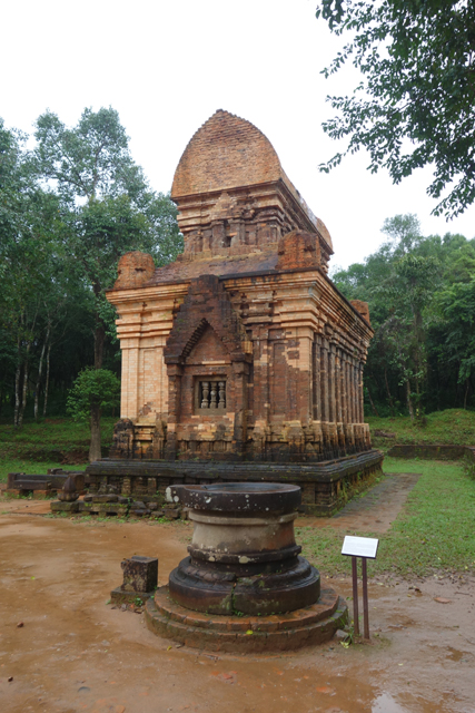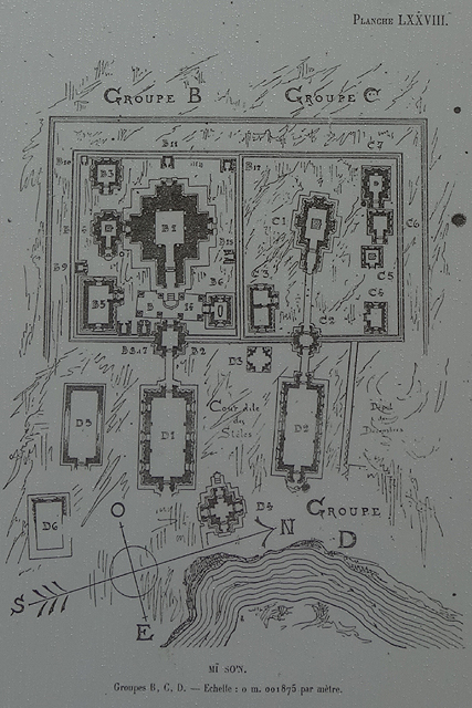 繞行一陣,我們離開BCD區,準備朝回程走。照地圖所示,鄰近有個A區,它建於十世紀,主塔A1被譽為「美山」的代表,學界也常以「A1 Style」形容同樣式堂殿,感覺該有著完整形體,週身刻鑿精微。可惜經過越戰的摧殘,受損最嚴重的也是這區了,塔殿全數傾倒。雖在法國殖民時,曾有學者繪下圖解,剖析了門廊的山形頂冠、牆面飾柱角塔、及細膩雕鑿的塔峰。幾尊鎮守八方的雕像,像是「雷神因陀羅」、「火神阿耆尼」、「水神伐樓那」、「風神伐由」,也早早送至「占婆博物館」免得被盜。對喜愛古文明的人,這樣的損失仍難以彌補。不免想窺探一下它的現況,在遠方緬懷,偏偏路徑早早封擋,由林隙也看不出什麼,可能接棒的人還在將散亂瓦礫與資料圖比對,絞盡腦汁嘗試再築吧。