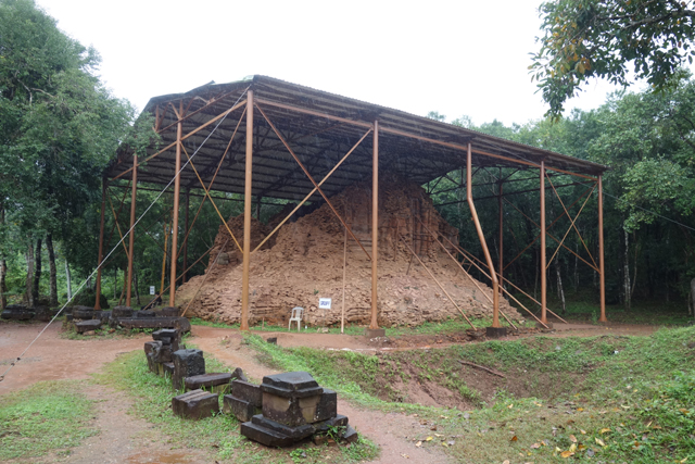 而隔壁的F區目前是大型手術台,簡易遮棚下為被鐵架勉力護撐的主塔F1,曾經密疊的磚體潰散滑墜,若不是還有塊平牆,一道像嵌了人像的龕室,可能會以為是施工時堆積的廢土。據說門楣本有塊精緻雕鑿,刻著多臂惡神「Ravana」搖晃「凱拉薩山」,被濕婆談笑間踏伏,塔座跟祭壇不僅各以鳥獸花卉妝點,還有精巧的引水淨滌設計,如今通通灰飛煙滅。這讓我不禁瞪向旁邊的大泥坑,那應是當時轟炸的彈痕,像個無法癒合的傷口,望來相當嘲諷。