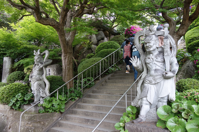 儘管此寺藤棚沒有「河內藤園」遼廣,人潮也頗擾,走著逛著倒讓我發現另種勝出亮點。不知是哪代主事者的發想,將院落各地綴了許多石雕小沙彌,他們有著各自的表情動作,每尊都令人嘴角不禁上揚。尤其藤棚下靠近外欄那區,乍看彷彿勾勒著鄉野古寺的閒趣,讀經之餘便是下棋、練功,怡然無憂。但由於是Q版,就有點像小沙彌趁老住持不在時偷著懶,練功中互相擠眉弄眼、姿勢惡搞,別人認真思索時卻從背後摸來驚嚇。