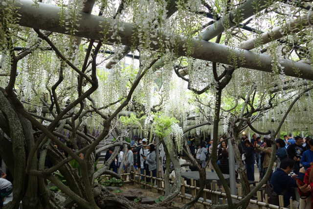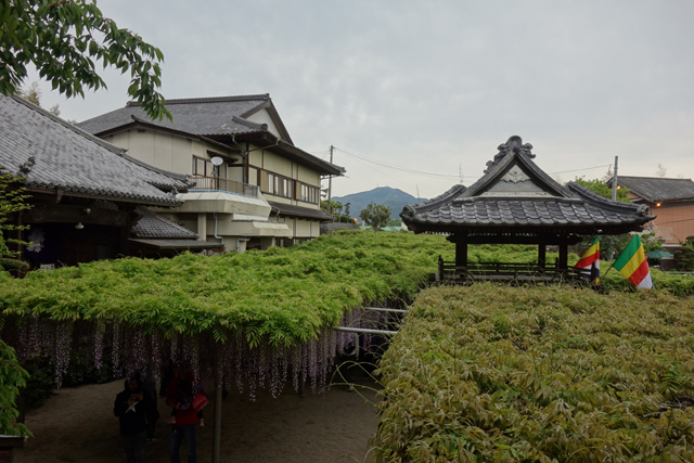 在外圍逛了一陣,我們穿入人群,也走進設於寺前廣場的棚架下,很明顯地,相比「河內藤園」的正值盛放,這兒的已是花季末,棚頂綠葉密織,垂藤上段亦微禿。但所謂數大便是美,由於半數藤花還堅持著,仍舊在疊層間推染為紫浪搖曳,讓人在抬望時,心也隨之蕩漾。當然這得先動用腦袋裡的影像處理器,同時關閉耳朵的音源輸入,自行抹去藤下的人跡擾攘,幸好我在這方面還有幾分修練,得以讓自己遊走於虛實之間。