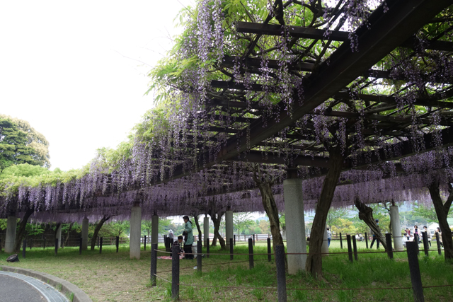 眺望一陣,我們下塔行入廣場大藤棚,很意外地,花景居然比本堂那區好,即便亦過了盛時,禿殘的區段並不明顯,或許該歸功它的佔地相對廣,互相掩護下仍成就了紫浪輕盪,當然沒有像「河內藤園」那兒的纖長披垂,但也值得花些時間感受逛望。只是為何多數遊客都擠在本堂那,就是個難以參透的謎,是全然不知這區?懶得多花時間步伐過來?還是日本人對藤景早習以為常,純粹為了參與祭典湊個熱鬧?