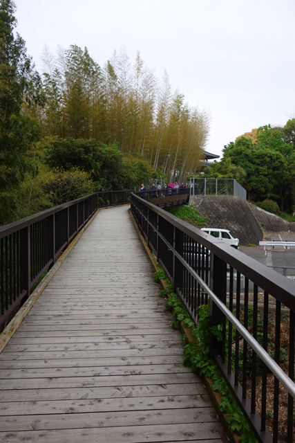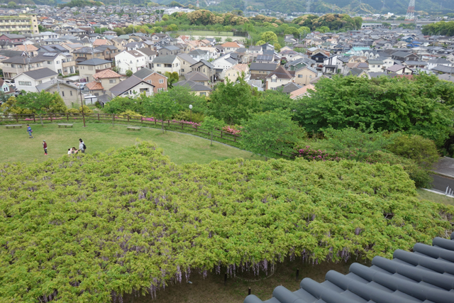 從棚路穿至公園,其視覺中心是座三重塔,遠望像與寺同存的古物,近觀才知為現代以類似形樣砌起的望亭。縱使如此,登高總是視野好,我們踏階而上,果真民宅灰瓦於眼下漫展,與蓊鬱山巒相嵌合,近處則為設於廣場的另個大藤棚,雖然棚頂綠葉茂密意味花況可能也堪憂,依舊勾起期待。