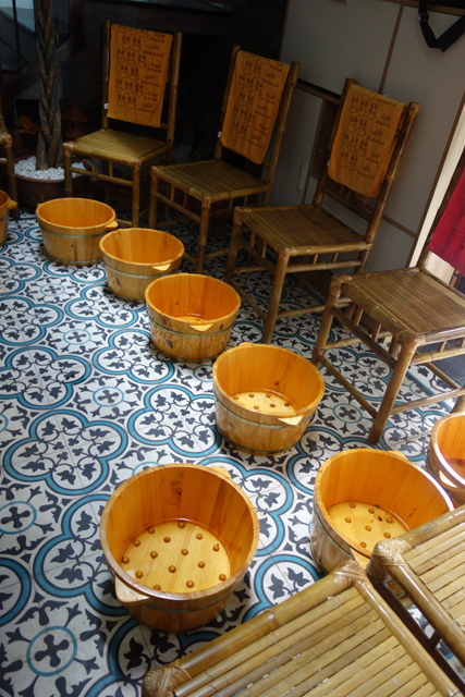 一日團的簡介沒特別著墨午餐,所以也不曉得會是怎樣等級,不過當驅車鑽進小巷,門面給予的印象還不錯,不僅非衛生堪慮的髒亂小店,還有經過設計的棚架、竹編燈、植栽飾板與小魚池。到二樓座位區坐定後,導遊說吃完可在另端泡腳,後來還真有阿桑往木桶倒熱水,逼我們在那發呆。這不免讓我傻眼,既然趕時間,這環節就刪了吧,又不是急行軍了一天。