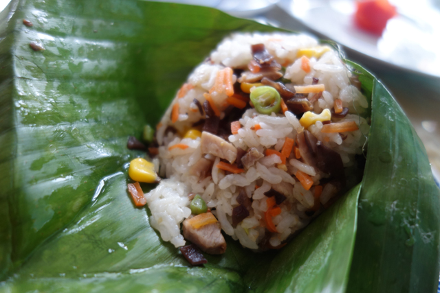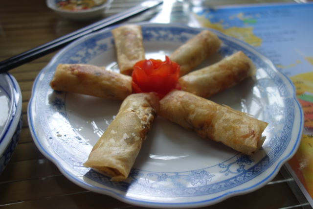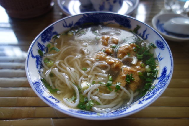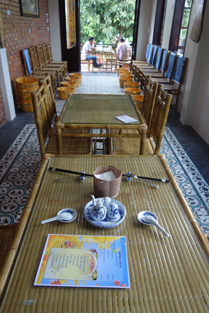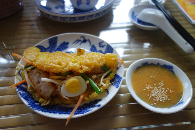 至於餐食,原本期待能點些昨晚沒吃到的特色點心,結果導遊說行程內含的就是桌上單子所述的套餐。套餐品項有五,英譯直白到毫無想像空間,而當菜陸續上桌,果真也是常見的牛肉河粉跟炸春捲,較意外的是當中的「Pancake」,竟是在「峴港」特別繞去吃的煎餅,有種白跑一趟的感覺…而扣掉甜點的這四道沒一樣是「順化」的類肉圓料理,看來緣分就僅昨晚那籃了。只能安慰自己那個很像粽子的東西還滿好吃,摻拌了菜肉餡料,似乎也是該店主打。