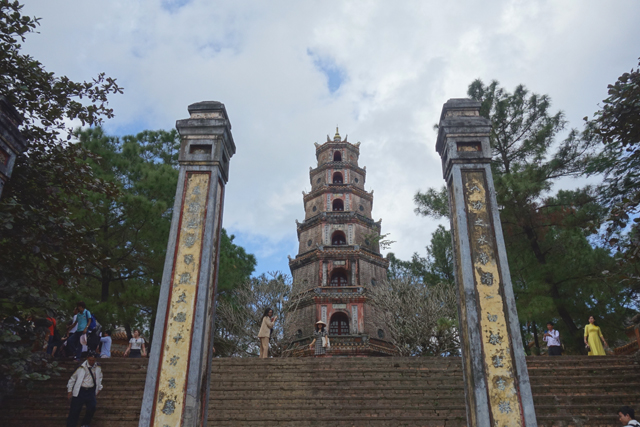 從成排立柱為引的階路往上,我站在幾乎成其門面的「福緣塔」前仰望,八角形體的它以七層漸縮,黯沉砌磚與斑駁漆色滄桑盡顯,然飛翹的簷尾依舊挑揚如冠,搭配窗花與鏤雕飾框,便凝鑄了曾見證過的繁華。它的築立比主寺相對晚,是「阮朝紹治帝」為紀念太后八十大壽而建,周邊另配襯了四座小亭,收置著各朝留下的相關碑文、可追溯至十七世紀的三公噸大洪鐘,讓人追想鐘聲曾能遙傳十里遠的年代。