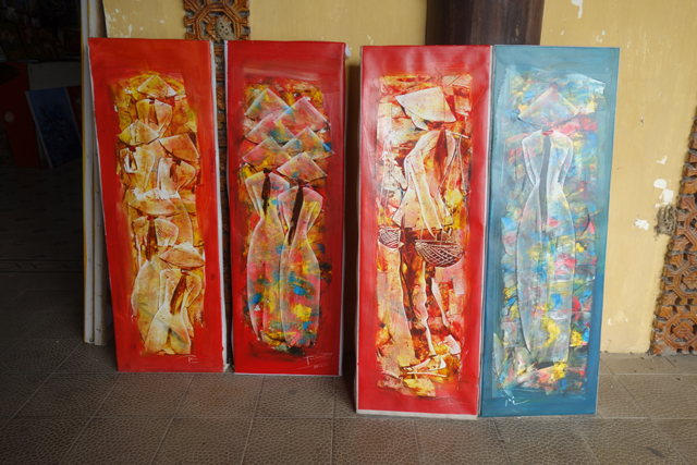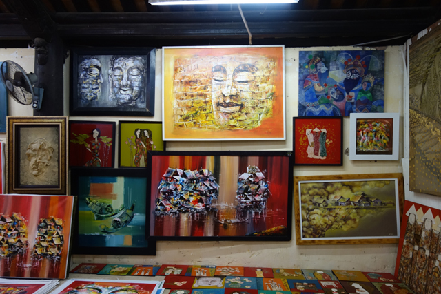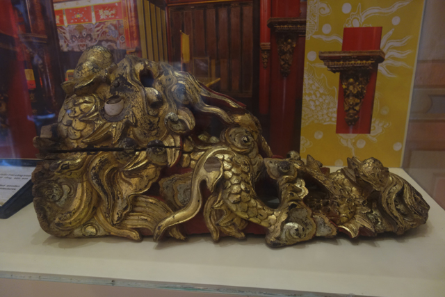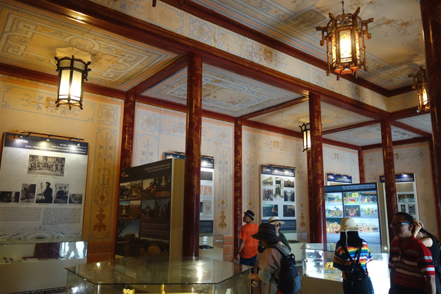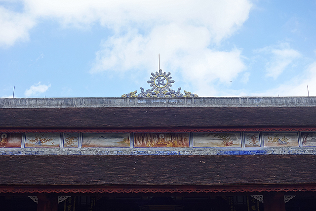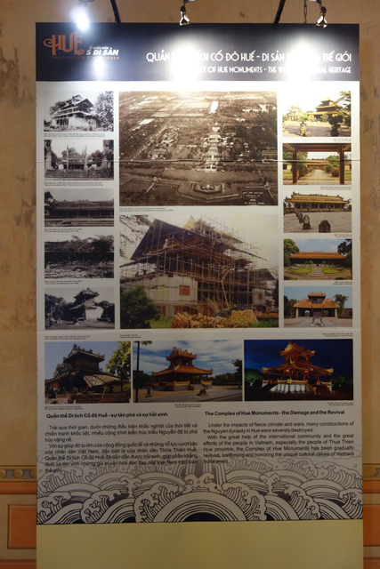 瞄過用來儲水以防火災的大水缸,行入餘剩的環廊,這兒掛了不少老照片,而「左廡右廡」被改建為文物展廳,除了能看到早年的簷瓦裝飾,也放了更多解說圖板。板上介紹著歷史、「順化」的重要古蹟,當然也記錄了越戰帶來的殘傷,一張張黑白畫面勾勒著宮內曾經的雕琢、戰後毀塌的觸目驚心、幾處努力重砌的前後對比。看著逛著,找到附屬的紀念品店,當瀏覽著風格各異的掛畫,沉落的心境總算歡悅了些,儘管仍沒找到一直想買的宮殿折疊立體書,還是有挑到喜歡的以捲紙裝飾的越南特色書籤。