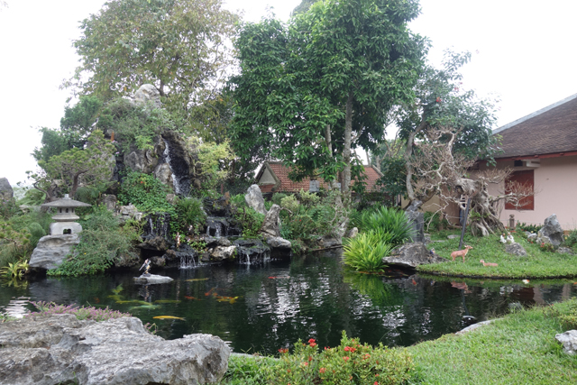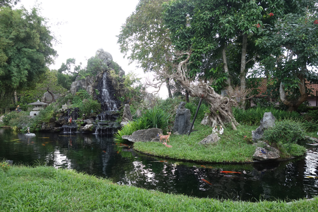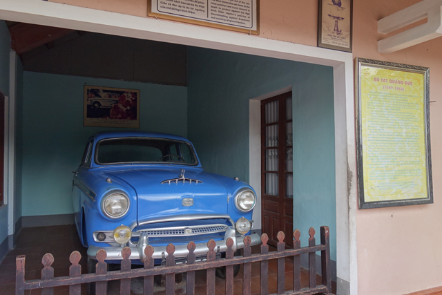 即便主殿亮點不多,兩側仍被僧眾經營出假山庭池,石燈流瀑,還有些趣緻的小雕像。鄰近的偏舍很突兀地收置了一輛寶藍舊款車,引人閱讀旁側的說明板。原來,在越共之前的南越政府雖是人民投票的總統制,其實也走入獨裁政權,總統獨尊天主教迫害佛教徒,以武力鎮壓抗議民眾,導致住持「釋廣德」乘坐此車到「西貢」當街自焚。了解過這段,對越共為何能輕易崛起壯大,就不那麼意外了,就跟當年秋海棠的染紅一樣,事出必有因啊。