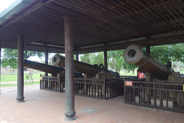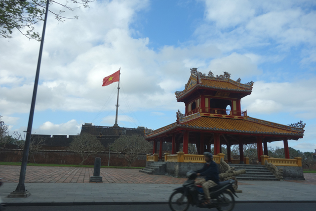 道謝過後的我在心裡放著煙火,隨導遊轉入京城,本以為既是遺跡保護區,應會見到不少封攔規制,怎料城池雖仍以外牆環圍,城門形構依舊,已與一般居地無差,不時有大小車輛在路上穿梭,只剩幾門大砲、守望兼儀典用的旗台還彰顯著早年氛圍。想想也對,皇朝都傾滅這麼久了,哪可能為了文物保護,就把已移居至此的人通通趕出呢。且所謂的京城,原就是隨著繁盛,不可避免融入了市集與商家,真正的管制區應在皇城。