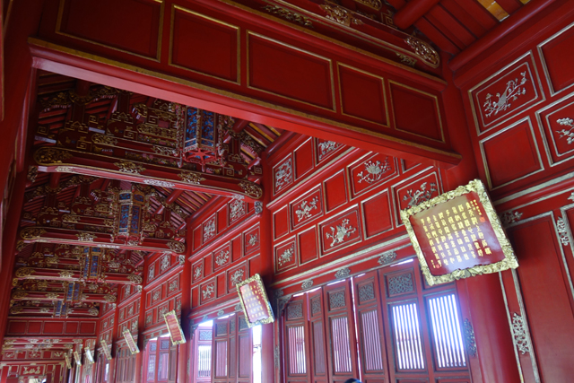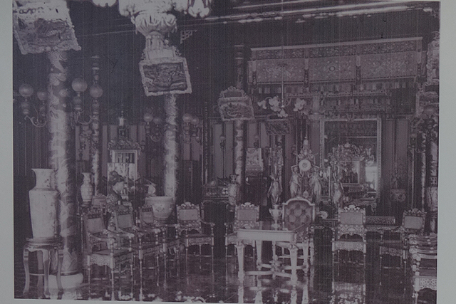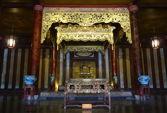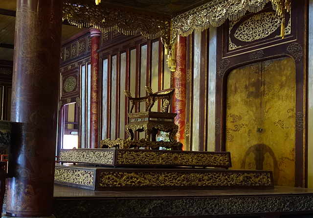 朝堂裡以深沉木色呈顯莊重,柱上隱現蟠龍紋繪,樑下以框板拼飾。最醒目的是王座,柱間用燦金鏤雕串接,雙層環圍,彷若華蓋垂簾,背板自是祥雲爪鱗,襯托皇椅的流曲輪廓與繁複刻鑿。但也只剩下這樣了,戰爭過去,能搬的早就被摸光,眼前所見的輝爍顯然是重建後的成果。