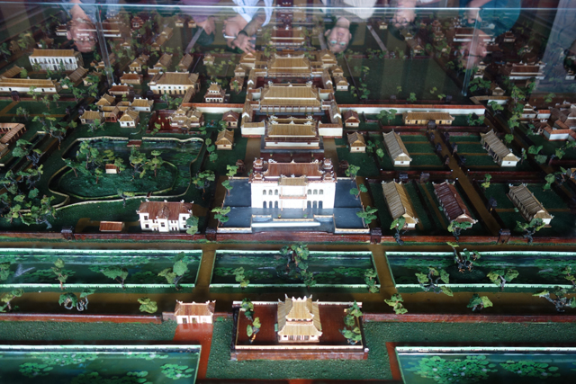 我在想像中擴增著周邊擺設,緩緩繞到殿後,這兒擺了皇城的微縮模型,儘管正面對上門口嚴重逆光,很難用相機記錄,從其餘的視角,仍能窺得初始格局。先找到目前所在的「太和殿」,往後的中軸尚有數座廣殿延伸,心處以牆框繞,輕易能推得是帝后寢區。再往旁,不同式樣的樓閣散點,幾區島池添綴林色,幾處別院自成世界,幾乎便是北京紫禁城的繁華榮盛。