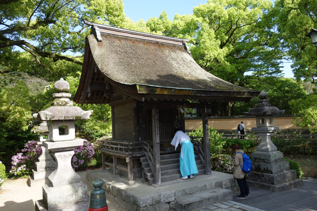 主道在穿過第二道鳥居後,隨「太鼓橋」攀升,劃穿了「心字池」,也將視野引入池外的林樹蔥蘢。池左較為開闊,島岩、噴泉,有著水線擊響攜來的爽冽躍動,右側則因兩座末社的佈局而顯得沉鬱,它們從橋徑岔生,幾許花叢伴點,以古樸墨簷在林蔭張出一隅靜謐。先遇上的是「今王社」,設計相對簡約,再過去的「志賀社」不僅簷線交錯挑飛,歷史也悠久,敬奉海神「綿津見」的它雖是室町時代重建之物,在幾番遭劫的神社裡,已成最古。這樣的佈局似乎也應和著橋徑的設計,前段橋身拉起的虹弧是過去,縱使曾大起大落都別太在意,珍惜著現刻,收攬貼水而望的景致,沉寂也是種恬淡福氣。