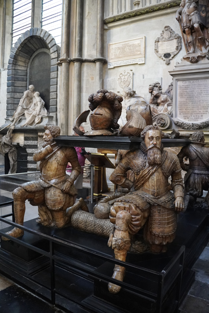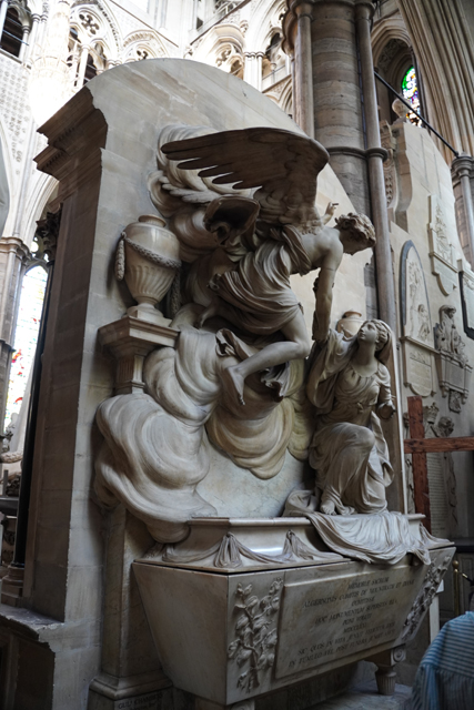 廳裡的碑塚亦繁多,很難辨出曾是供人靜禱的禮拜堂。循序逛入,近處的一座為少見的軍士抬棺,棺蓋散置盔甲,棺內塑了主人銅像。中段為兩座類似主題的反差呼應,一側是天使接迎從墓中飛升的妻子,一側能見死神由地底爬出,相當猙獰。導覽特別介紹了這一處,其主人為「南丁格爾夫人」,不僅兒子們早夭,她也在早產虛弱之際被落雷嚇死,紀念碑因此刻畫得衝擊,乍看像老婦其實是丈夫的慌怒拒擋頗為傳神。最裡獻給初代「Norris公爵」的亦醒目,不僅以柱列撐起頂蓋,又往上堆疊了立方塊用敘事浮雕環綴,此外尚有六個兒子隨棺面壁跪禱,連跪墊都刻得精細。