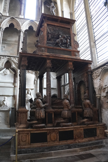 在右側廊與「伊莉莎白一世」相呼應的,是其冤家「蘇格蘭女王瑪麗」,也有文章稱之「瑪麗一世」,很容易跟「血腥瑪麗」搞混。她是「亨利八世」姊姊那支系的,雖因祖母嫁去蘇格蘭,讓她在英格蘭王位順序較次,仍是「伊莉莎白一世」忌憚的對手。由於命運多舛,還流亡被囚最後淪為刀下魂,常成為幫戲劇添色的題材,即便如此,她的紀念塚仍相當尊榮,除了類似的墨柱華蓋、金紋勾繞,頂部又高出一截,並以躍馬烘托氣勢。