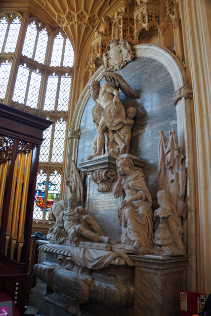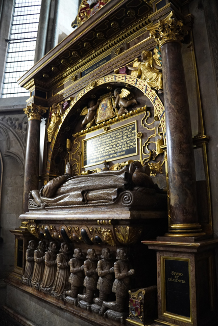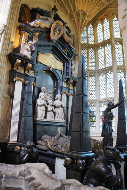 而隔壁的「聖保羅禮拜堂」,光嵌於隔屏的碑塚就很華麗了,徽章令其色調斑斕,又勾了金漆,鮮亮的程度顯然近年有翻新。置於中心的是「Daubeney」夫妻,彷彿很怕被盜般,特別用鐵籬圍護。壁面亦有某下議院議長壁龕爭高,底座可見其三子五女跪侍,紋帶上串了細緻團花,金漆輝耀。