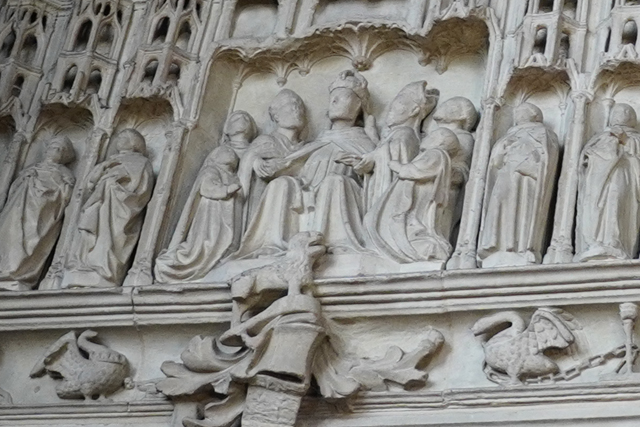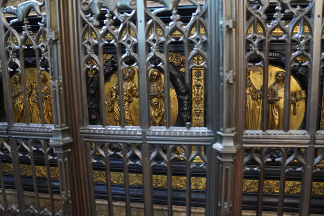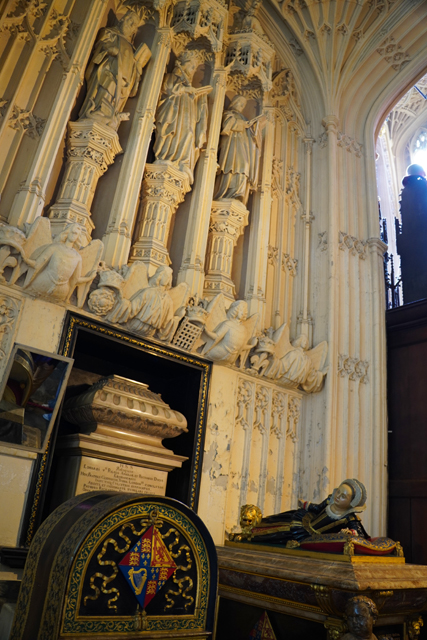 我走到近處端詳,塚前承接了過往,以文藝復興式的祭壇奉著聖母子像,花藤飾帶描金,頂部有天使庇佑「都鐸」盾徽。繞往後,圍籬即便轉為墨深,卻如精雕屏風,於支柱嵌入人像,櫺格繁複成窗花。然相關的飾綴不止於此,往內窺望,除了蓋頂兩夫婦的塑像,棺側尚有一幅幅的聖經圖刻,引人探究其間故事。