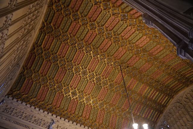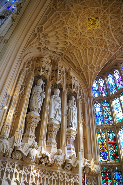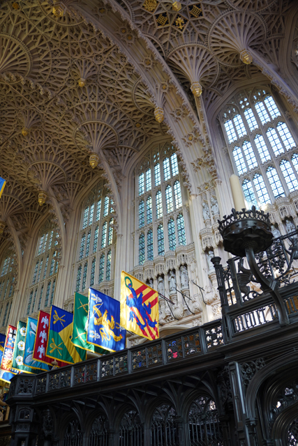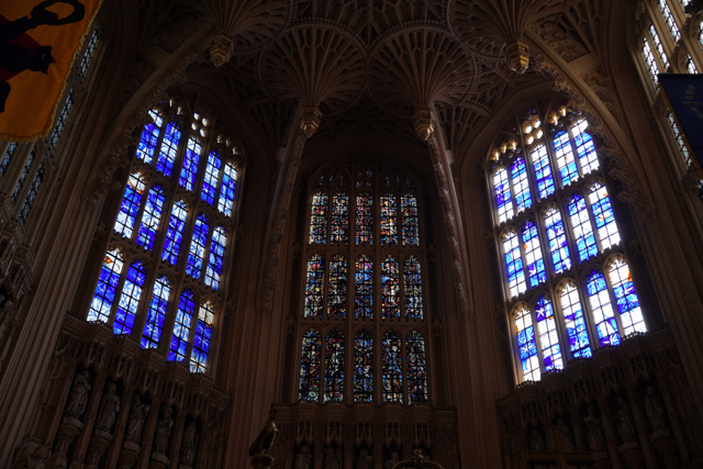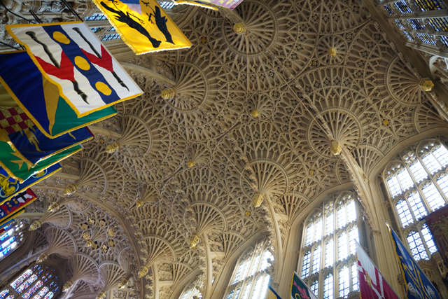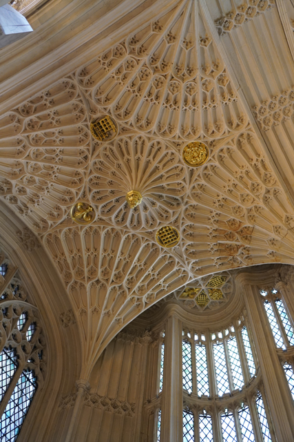 唱詩班席無疑地相當撩目,偏偏此堂尚有更炫眼的把它逼成配角,當隨展揚的旗幟朝上望,天篷以極為花俏的扇形拱肋將空間罩覆。相對「劍橋國王學院」以樹冠般的高偉取勝,格局有限的它改走細緻路線,散射的框格在圓潤與挑尖中流轉,於交切後開綻朵朵花葉,連主肋都雕出連串弧躍。幾個石鐘乳般的匯聚是其間精華,它們呈馬蹄狀排列,在堂尾繞圍出迷人圖騰。