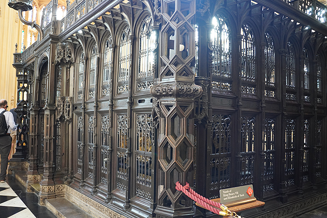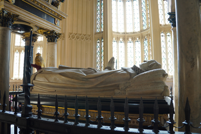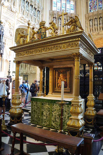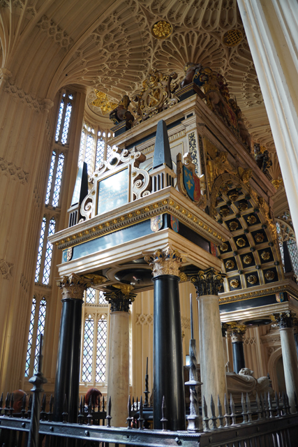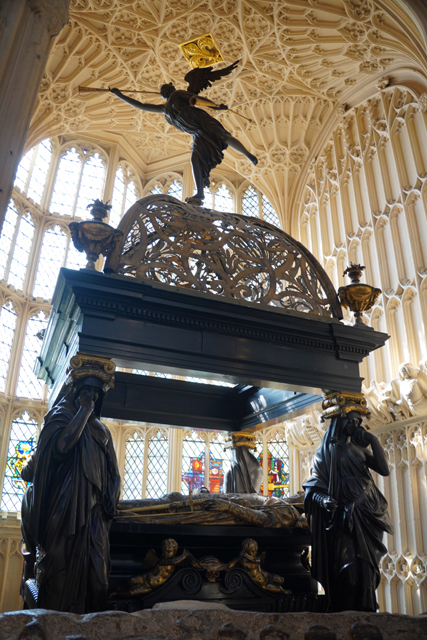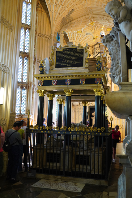 被這些繁花圖騰照映的,就是「亨利七世」的棺塚了。他殺死據說是個暴君的「理查三世」,並以「蘭卡斯特」之首的身分與「約克」家族聯姻,結束「玫瑰戰爭」,起始了「都鐸王朝」。雖說成王敗寇,以如此的歷史節點,被榮盛奉於堂心其實挺合理。
