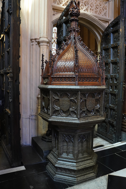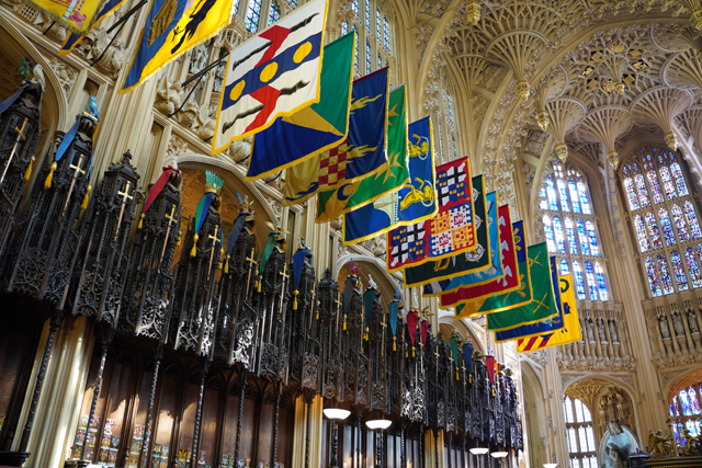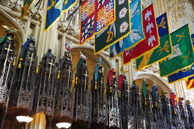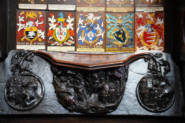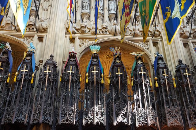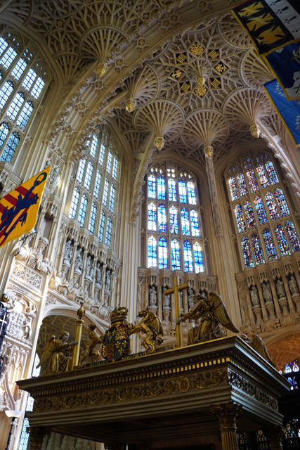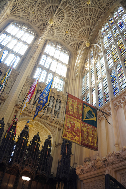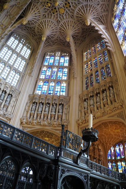 它設有自己的唱詩班席,雖不像前頭那區金炫,綿延的繁複尖冠卻似騎士們的化形,手拄長劍,頭戴戰盔。戰盔或張揚著翅翼,或以獅馬撲躍,如家徽的變體,甚至還有正擲出閃電的手臂,頗為獵奇。會有這樣的設計,是因為此處也是「巴斯騎士團」的母堂,被授予「巴斯勳章」的高階騎士們,每隔四年會在此舉行儀典。較尷尬的是,由於席位有限,想披掛上自己的戰盔旗幟,可是得等前人凋零,然過世者也非就此被遺忘,仍可在背板留下小勳章,若隨時光整面拼貼完,想必又是更進階的瑰麗。