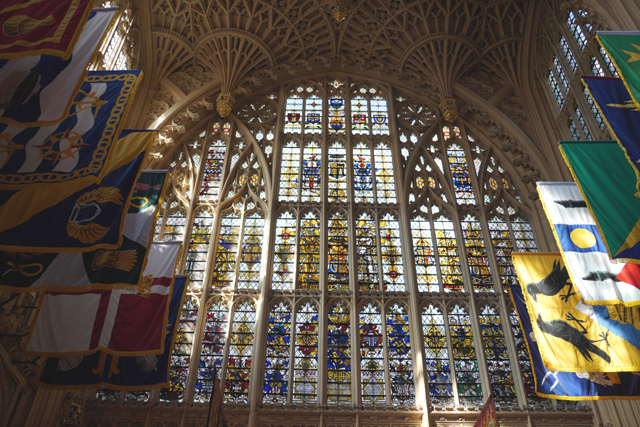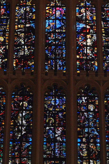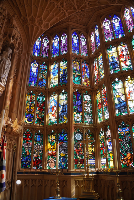 通常是要角的彩窗在此堂也沒缺席,朝西那面展現了王權,能見金炫盾徽接併。向東的回歸宗教,聖母為核心,諸多天使環舞。這些繪彩雜著抽象式的塗抹,很明顯製於近代。底下的小堂「RAF Chapel」更直接點名獻予在二戰犧牲的皇家空軍,將英魂結合聖經,藉窗花與聖母子同框,搭配鳥羽繽紛異常。