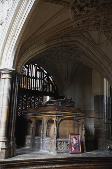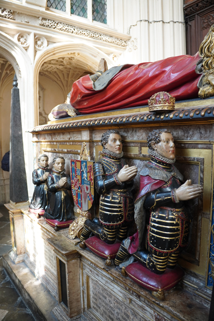 擺在前方的彩棺屬於她姑姑「瑪格麗特·道格拉斯」,兩側跪侍的四子四女,多數都比她早夭。跟著人流望過護守「瑪麗」的戴冠紅獅、塑像容顏及華服。後段尚有「瑪格麗特·博福特」的棺塚,她是「亨利七世」的母親,前日探訪的「劍橋聖約翰學院」就是由她出資。塑像穿著寡婦形象的頭巾披袍,顯然曾一身鎏金,兩邊還襯躺了雕柱般的物事,不知有何隱意。