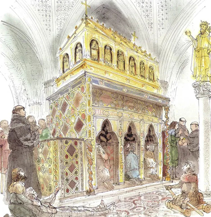 為了與聖人更加接近,不僅是將教堂大幅重建的「亨利三世」,之後的「金雀花王朝」國王們也將棺塚設於此,「愛德華一世」、「愛德華三世」、「理查二世」、外加幾位王后,形如一道環牆。這些棺塚頂蓋多半有著塑像,高置於台便很難看個端倪,能給遊客近觀的僅僅棺壁,也因為如此,表面曾經的馬賽克已隨著時年被摸光了,刻飾亦缺損。仍亮眼的只有位處末端中心的「亨利五世」,他的棺塚之上另添了一座禮拜堂越過環廊,以隱於雕柱的螺旋梯相接。當抬頭仰望,小龕室羅列、人像雲集,還能看到迷你的他被加冕。