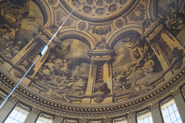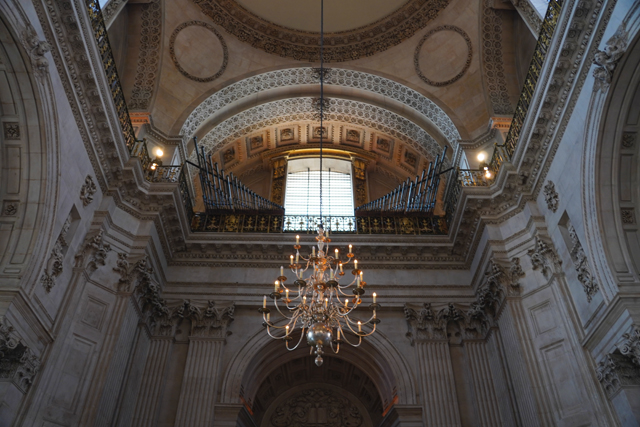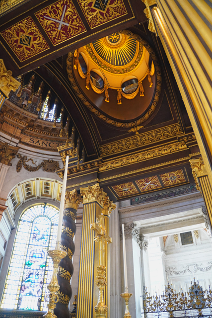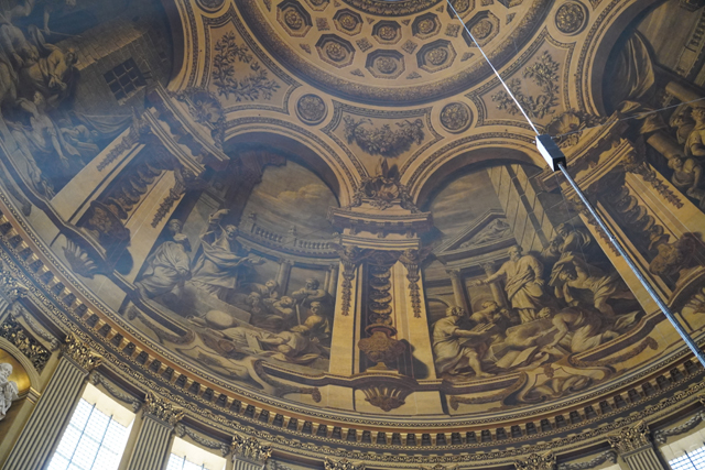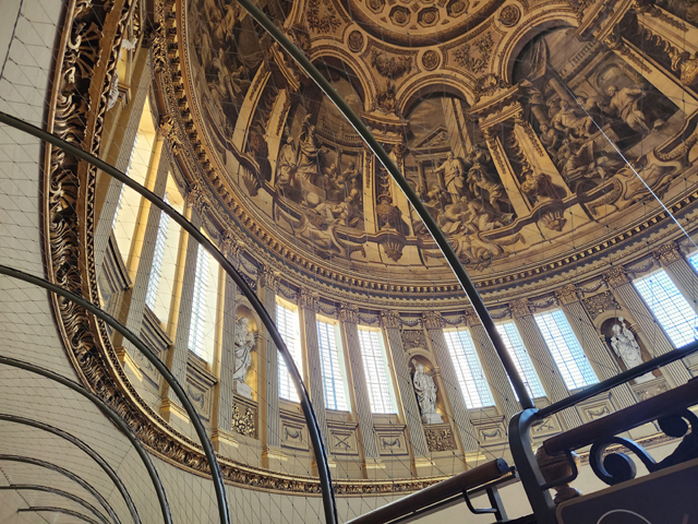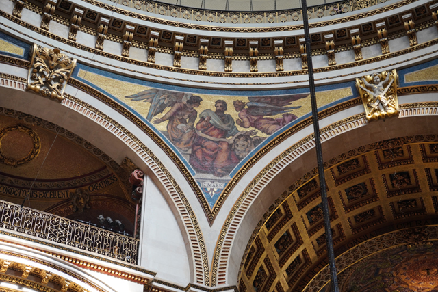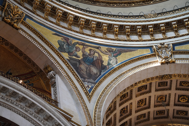 相對之下,身處的大拱頂就顯得反差,「James Thornhill」明明於「布倫海姆宮」前廳、於「格林威治舊海軍學院」彩繪廳,交出絢麗的天篷畫,卻像為貼合教堂初始的古典簡潔,選擇了灰階。我在附近找了地方坐下,抬頭仰望。上頭圖騰框邊浮凸,填飾的團花垂藤現著陰影,相當以假亂真。八個弧框內的主體則挺容易辨,是保羅的生平。