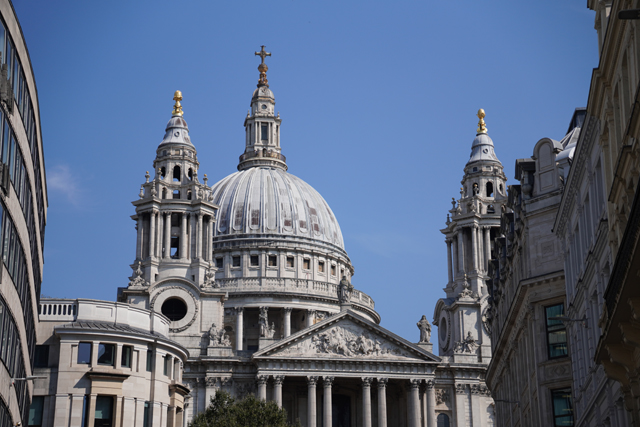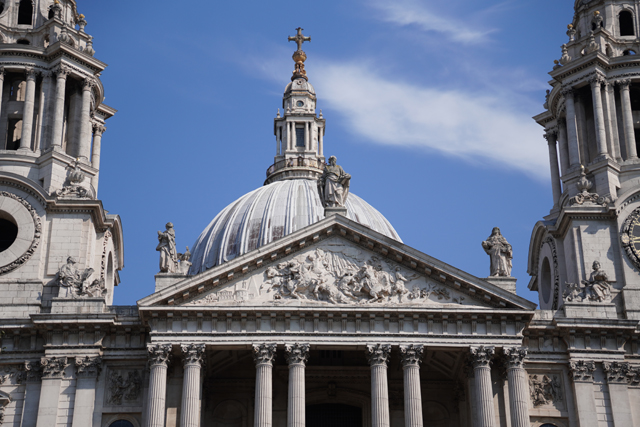 宗教上亦有相似感覺,一般都會以為「西敏寺」是倫敦教區的龍頭吧,但「聖保羅座堂」(St Paul’s Cathedral)才是這兒位階最高的,並以截然不同的裝飾風格引我過去一觀。循著大街續走,座堂在遠方現出些許,雙層柱廊支著山簷,塔峰的勾勒也漸漸完整,這幾天拜訪的教堂幾乎是哥德式,它卻擁抱古典,以巨大拱頂作視覺核心,伴塔則多了扶壁凹曲、飾柱進退,稍稍往巴洛克靠攏。山簷的雕飾挺好認,在頂尖持劍的顯然是聖保羅,三角楣刻繪了他被耶穌感召的那瞬,能見他從馬上摔落,愣愣抬望天空的聖光。