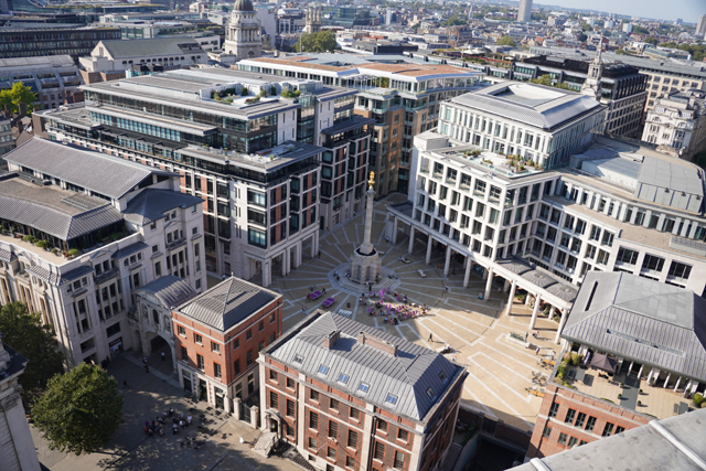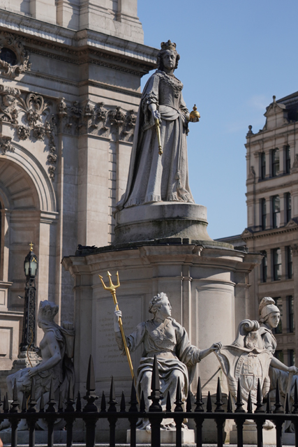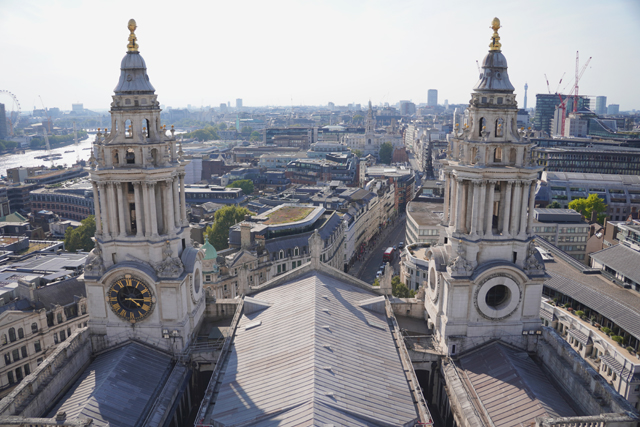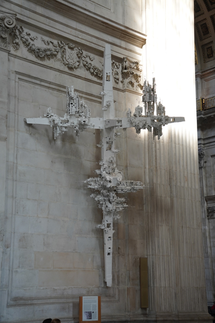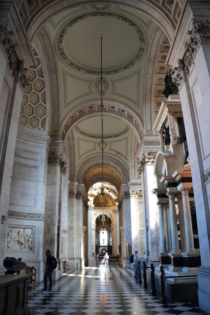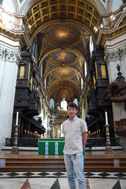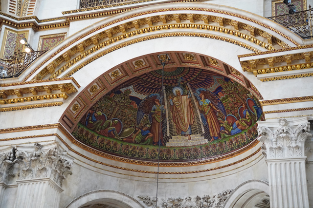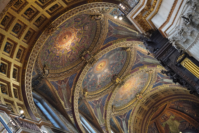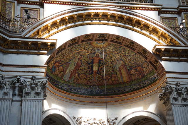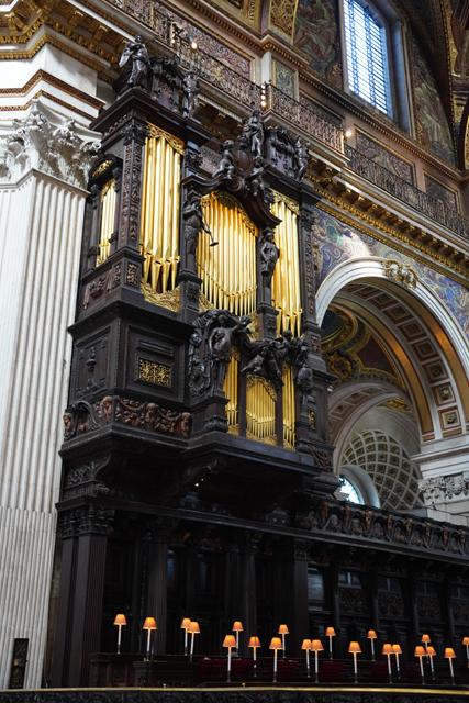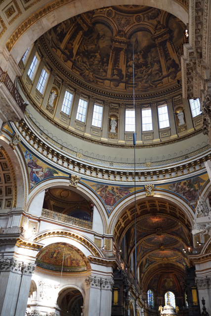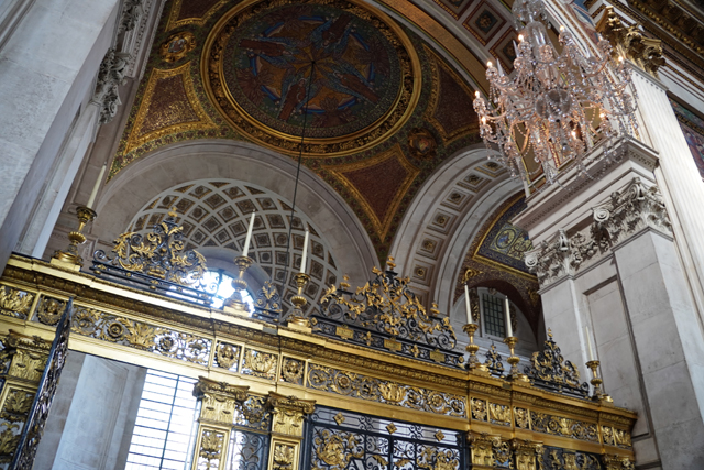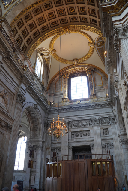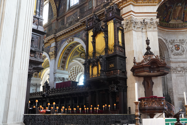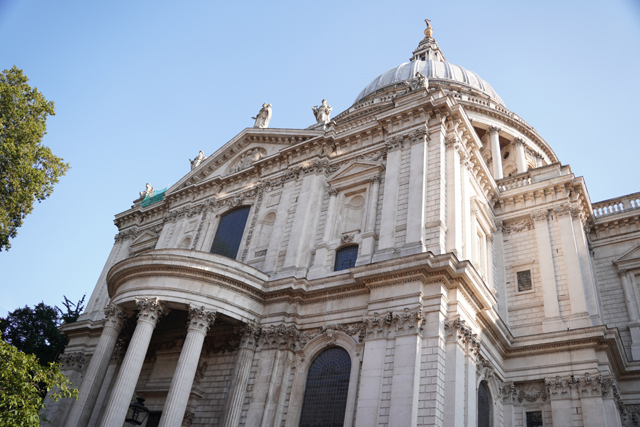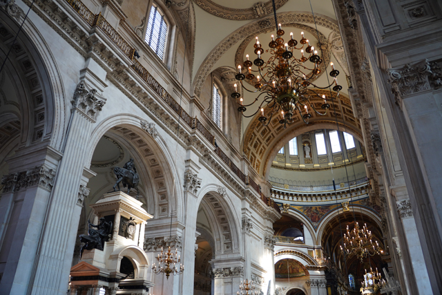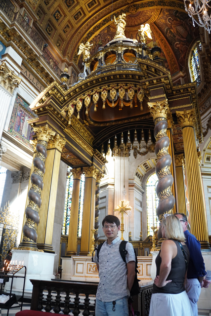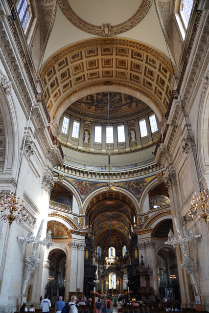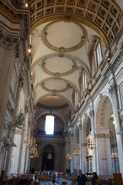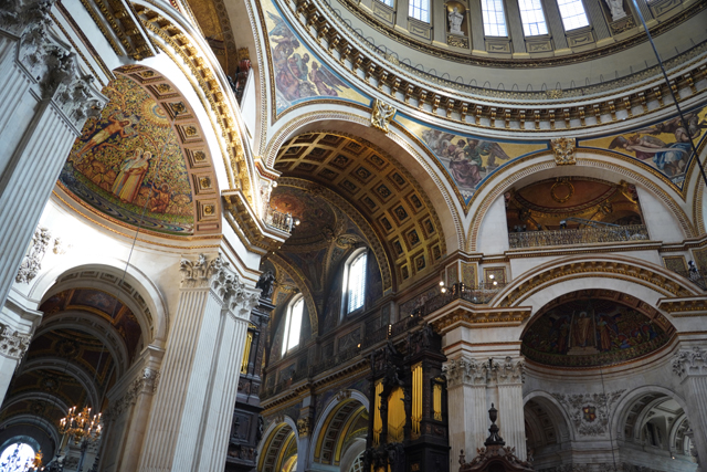 既作為倫敦的主教座堂,其歷史自然古遠,七世紀便有了第一座。經過幾次火劫,初始的諾曼式形構換替為哥德,有高聳的中央尖塔作標誌。可惜這榮光沒持續多久,先是一道落雷毀了尖塔,百年後又遇上「倫敦大火」將其燒成殘垣,迫使它再次改頭換面。但我也沒時間感嘆了,從「西敏寺」走來本只要三十分,東拍西望,又拐進「聖殿區」,最後竟花了一小時半。於是只再多看幾眼廣場跟其同時代的「安妮女王」雕像,就趕緊登階進殿。