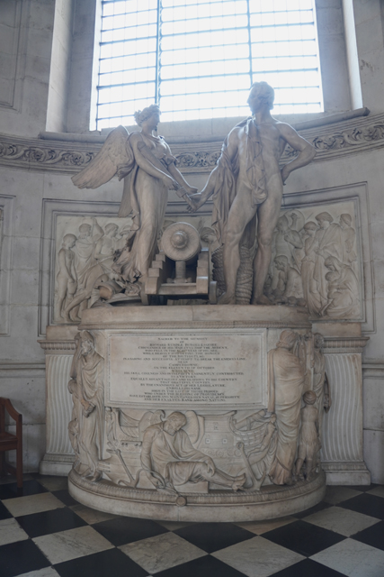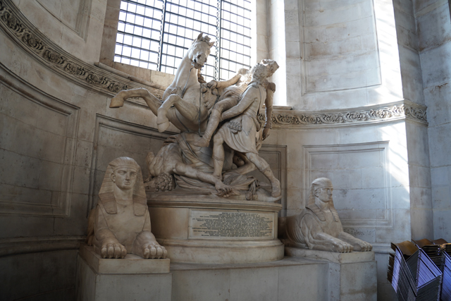 看過近處的洗禮池,我逛去側廊,這裡的紀念碑沒像「西敏寺」擺得滿坑滿谷,比較類似點綴用的藝品,幫牆側那些弧凹龕室添色。例外的是左邊列柱間那座,山簷弧拱堆砌為塔門,塔頂又立了一尊騎馬人像,感覺應是特別顯貴。也的確,他是「威靈頓元帥」啊,早年在印度建立功勳,回到歐陸也戰績連連,「滑鐵盧」一役更是擊敗拿破崙,名留了青史,之後還兩度擔任首相。