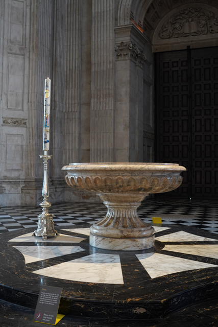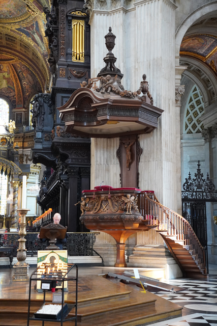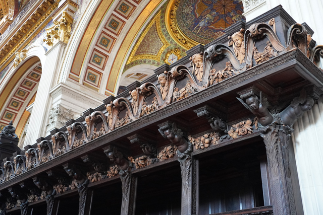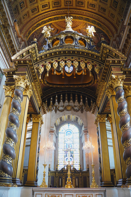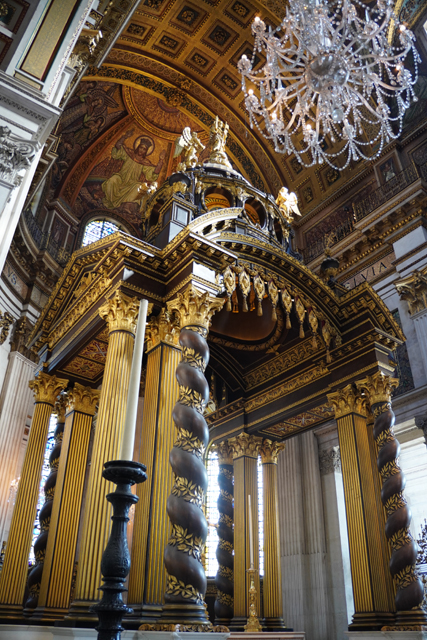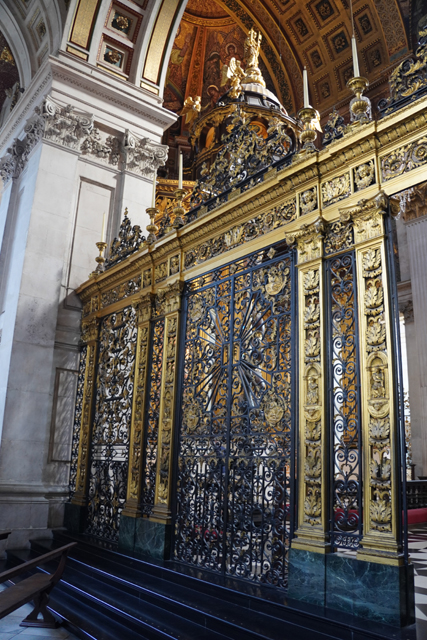 據說它出自教堂設計師「Christopher Wren」的草圖,可能是覺得調性不合,一直沒實作,立在此的僅為大理石祭壇跟屏風,是二戰空襲將整個東端炸毀,才由後人化生。繞賞之際,也順帶望向唱詩班席,這端依舊不讓進,只能看看近處以小天使撐托的雕琢。