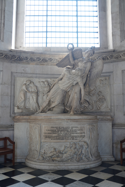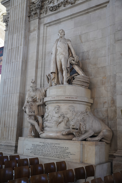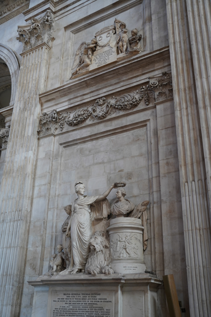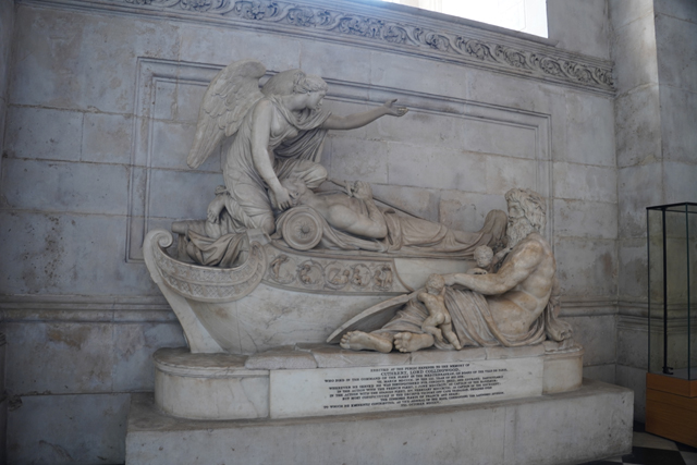 拐往南翼,這兒的調性類似中廊,只在花藤飾帶呈現繁複。而一般會依附在此的禮拜堂似乎缺席了,側處弧圓的空間成了紀念碑的展廳。我讀了一下碑文,多是些將領,有船隻、海神點明其殞命地點。配襯人面獅身的令目光駐留了幾許,他也跟別人不同,彷彿亡於揚蹄馬上。多查了資料,這位「Ralph Abercromby」的功績還真在埃及,最後於「亞歷山卓」中了彈。相對這幾座的癱軟、驚愕、哀傷,「納爾遜中將」的就偏正經,也沒「特拉法爾加廣場」那的地利,腳旁圍了代表英國的女神雄獅、拿他當榜樣的小孩,台座則是各戰役的擬人化形。