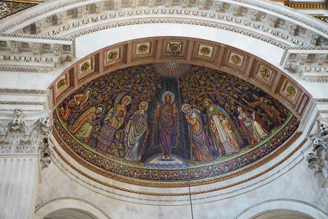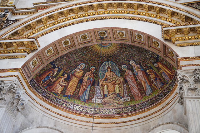 對角略低處的裝飾性半穹亦有馬賽克,皆是以耶穌為主角的場景,或藉釘上、卸下表達哀傷,或用復生、顯靈帶來威懾。情緒各自不同,卻都填滿了繽紛花葉,襯托更裡的唱詩班天篷。從資料看,它們出自同位藝術家,構圖也呈現類似的滿溢。我努力將視線往高遠處拋,以展臂天使撐托的三個圓頂像描繪上帝的造物,心處如日輝爍,周邊環圍著林野海洋,能見走獸覓食、游魚騰躍、飛鳥翱翔。末端,則轉為基督與天使們的照撫。
