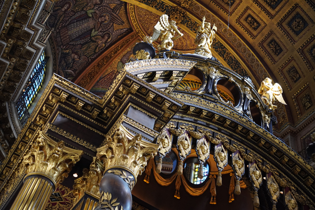 仰望過穹頂,唱詩班席本該是接續賞逛的重點,被連同中央祭壇封擋,就只能先看講道壇。它很顯然是巴洛克風格,擁有曲弧護牆,配襯吹笛小天使,華蓋亦能見他們高舉花串。深沉木色延伸至席內兩側的管風琴,凸顯管柱的炫亮,天使們轉換為成熟風韻,誘人想像其間奏出的樂響。