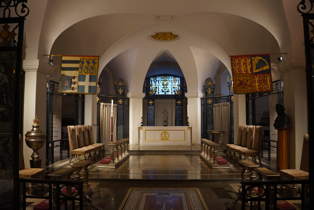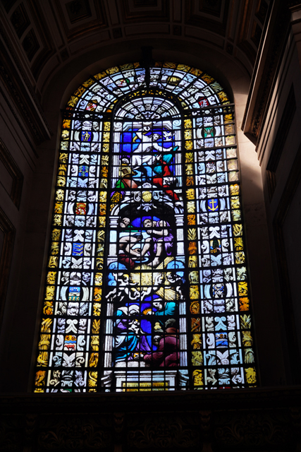 然後我將視線落在教堂的最末,這裡有個「American Memorial Chapel」,紀念二戰美國於此的參與跟犧牲。雖僅是個簡易隔出的壇桌空間,卻擁有在此堂挺稀有的彩窗,它從耶穌誕生、保羅受感召,繪至受難及復生,在框邊鑲飾的,是美國各州的徽印。