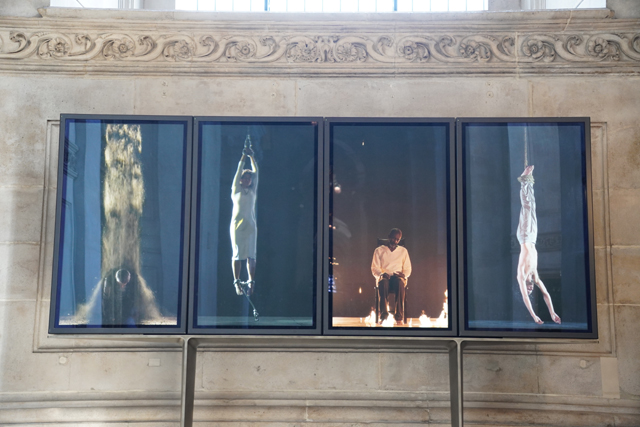 不過廊末的側祭壇還滿特別,居然是數位形式的啊,為用螢幕播放的聖殤,能見真人扮演的聖母抱著耶穌,哀傷眼神緩緩挪移,盯看兒子蒼白無力的裸身。相呼應的另側為殉道,主角分別被懸綁著、倒吊著、或火烤、或瀑淋,讓人從現世回溯遙想,悼念諸使徒的艱辛與身祭。
