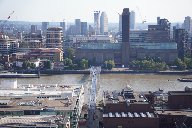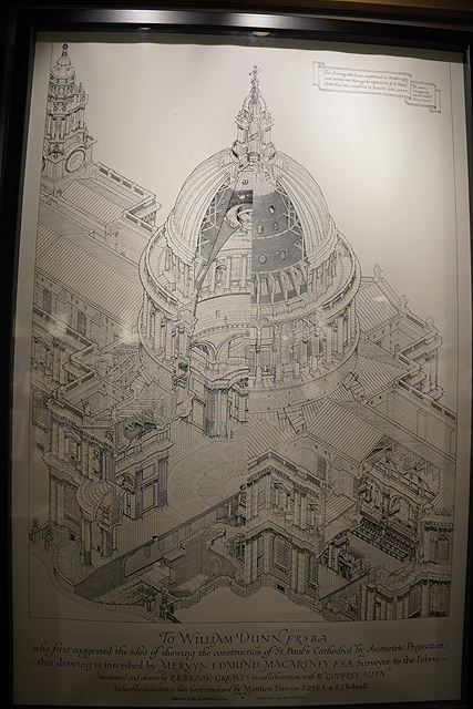 亦有目前版本的模型,供人以俯瞰視角欣賞雙塔襯飾的大拱頂,同時也附了結構剖面,顯示壁畫所在其實是內拱頂,藉其巧妙分散受力,才能支起外頭所見的巨碩尺寸。讓我多望片刻的尚有幅彩繪,它似是取了某種想像視野,將大倫敦地區的教堂們壓縮同框,於是以金漆綴點的群塔們簇擁著正中的「聖保羅座堂」,宛如一座奇幻之城。