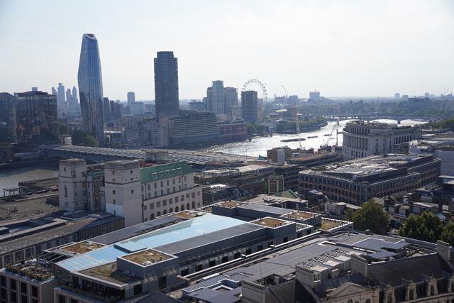 對英國腔仍沒調適過來的我跟旁人確認,得到的答案不啻晴天霹靂:「有人在塔頂昏倒了,要等救護員來,所以上頭全卡住。」天啊,身體這麼差就不要上來害人啦,我不禁在心裡咒罵。然木已成舟能奈何,與其罰站到天荒地老只為在略高處瞄幾眼,不如去博物館還能看更多。便果決放棄排隊,挑了幾個欄間缺隙,把地標拍一拍。泰晤士河岸是一定要的,倫敦最高建築「碎片塔」也不能錯過,快速抓了正門雙塔的視角,順帶找到近處廣場的「倫敦大火紀念碑」。只是也無心感受風光了,算對自己有交代便趕緊下樓。