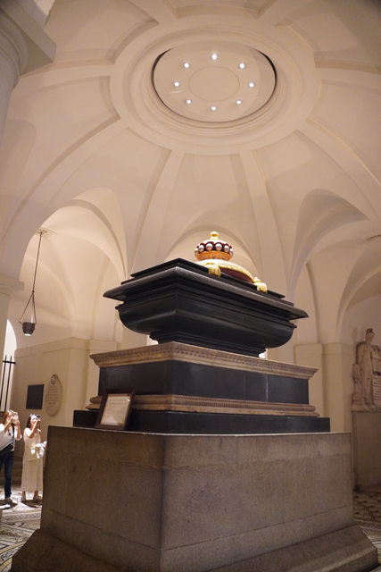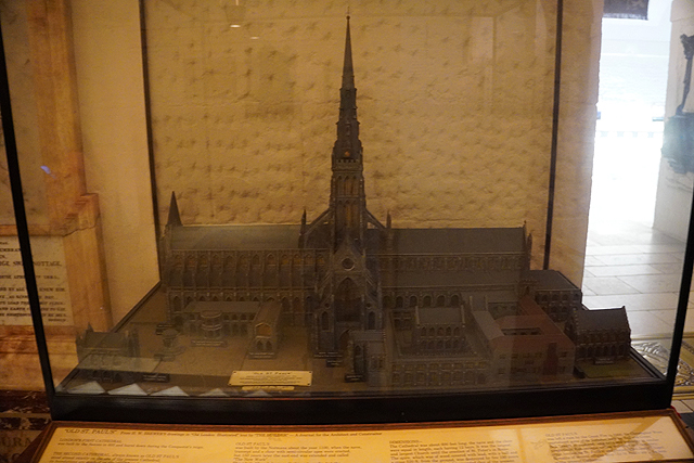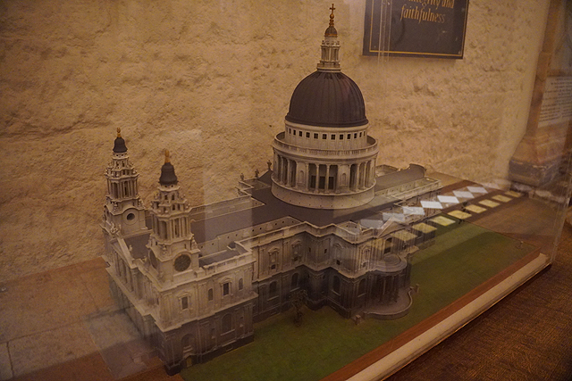 耽擱如此久,地底墓室就僅能草草瞥過了,東側對應上頭的唱詩班席,被打造成功能齊備的禮拜堂,簡約妝點的低矮空間裡,設有管風琴,座席滿佈。雖跟預想的殘頹古樸完全兩樣,在這時倒也方便我斷捨離。往西側走,「納爾遜」在上頭的紀念碑被作得不太起眼,棺塚卻被高規格奉於地下層中心,同軸線另有「威靈頓」相伴。附近的展物相對引人,有早年哥德版本的模型,看起來是對稱的十字結構,翼廊立面如山,纖細扶壁撐起銳尖中塔。據說當時的量體不僅為英國之首,就算在歐洲也能排入前三。