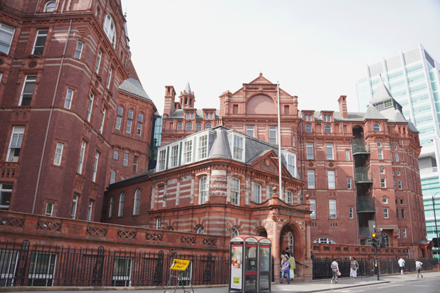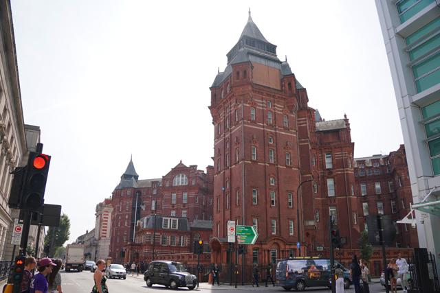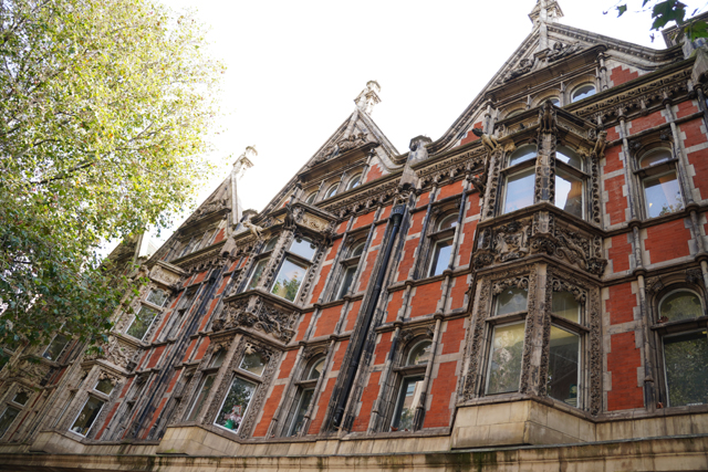 坐地鐵環狀線到「Euston Square」,出站後經過「倫敦大學學院」,其中的「Cruciform Building」相當吸睛,它以十字或者該說是X形立於街角,磚紅色澤,哥德復興式的錐塔,心處出探的門樓加襯弧圓修邊,沒看標牌可能會以為是什麼宮。不禁查了資料,這棟曾經的大學醫院與「自然歷史博物館」同位設計師,難怪有類似的貴氣壯偉。