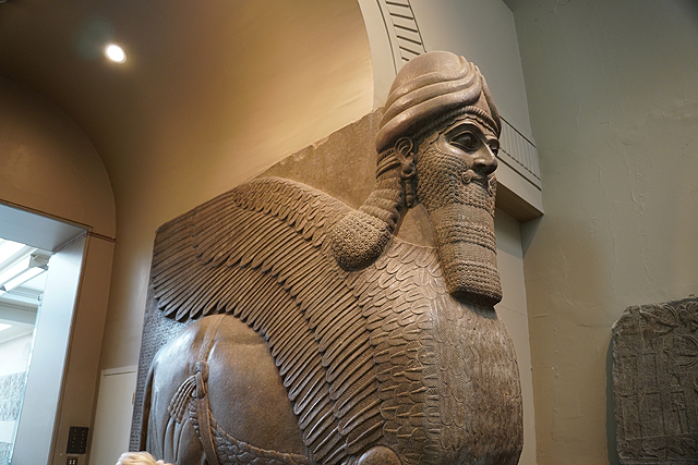 依計畫朝會提早關的「亞述區」衝,它位處西翼,路上會經過很具惑力又萬頭鑽動的「埃及區」,但不可以分心。如此找到了展間Room7,入口有對神獸相當醒目,它名為「拉瑪蘇」(lamassu),有時也將雄性分出來稱作「捨杜」。其頭部以國王臉顏雕刻,戴冠捲鬚,身軀則是揚著翅翼的牛,由於位處門側,為同時呈現正面的立姿與側向的行走,數起來就會多一隻腳。