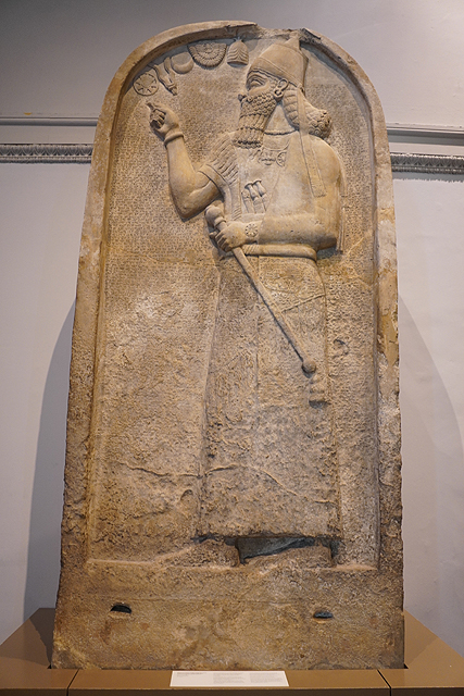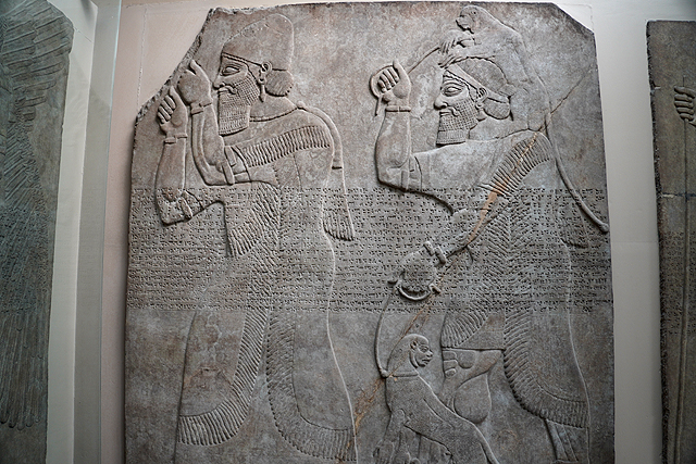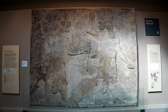 瞥過帶有敘事圖刻的黑白方尖柱,我原路折返,穿進北側的Room9。此廳的主題轉換為「尼尼微」(Nineveh),即「新亞述」在「尼姆魯德」後的新都城。這之間的一百多年,其國力曾因地方割據而衰微,在「提格拉特帕拉沙爾三世」的強勢主導下才再興。繼任的「薩爾貢二世」亦雄才大略,於擊敗以色列後擘劃了新都「Dur-Sharrukin」,據說佔地廣袤,殿廟塔閣接連,但由於意外陣亡,被接替的「辛那赫里布」(Sennacherib)認為不祥,就又將其廢棄,遷至目前為人所知的「尼尼微」。