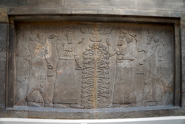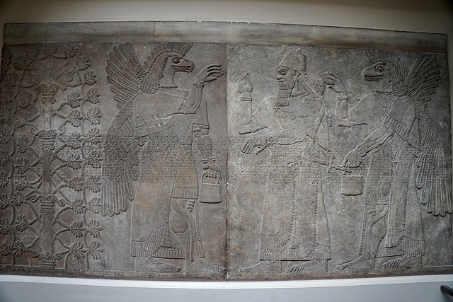 擁有如此國力,王都「尼姆魯德」合理發展得榮盛,位處西北,「亞述那西爾帕二世」(Ashurnasirpal II)的宮殿是其中代表。除了宮門的「拉瑪蘇」,殿牆皆佈滿雕刻,國王的出現不在話下,可見悠哉的宮廷生活、使臣攜著動物的納貢。此外尚有造型相似的帶翼保護神,他們多半提著小籃子,以松果沾取聖水點灑,搭配圖騰般的生命之樹、嵌著太陽神「夏瑪西」(Shamash)的展翅圓盤,象徵賜福和豐收。使我疑惑的是各尊的身分,這麼多帶翼神都是同一位嗎?頂多分鳥頭跟人首兩種?
